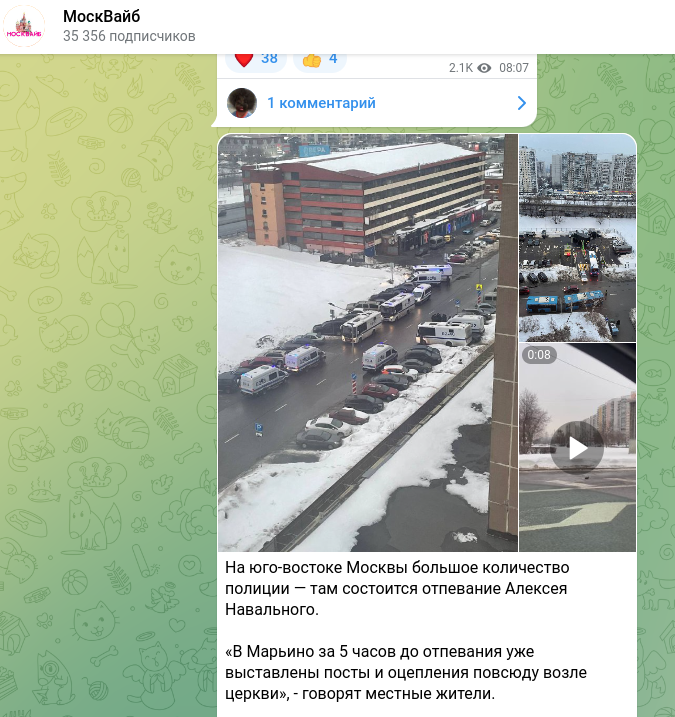 В районе Марьино с утра много стражей правопорядка. Это уже заметили местные жители. И неудивительно. Как уточняет телеграм-канал "МоскВайб", в местной церкви состоится отпевание Алексея Навального*.