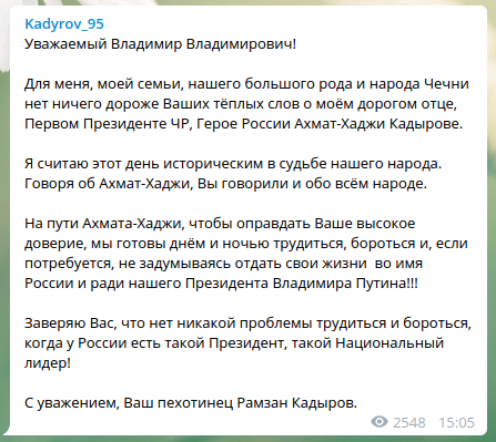 15:12 "Пехотинец" Рамзан Кадыров - президенту России Владимиру Путину: