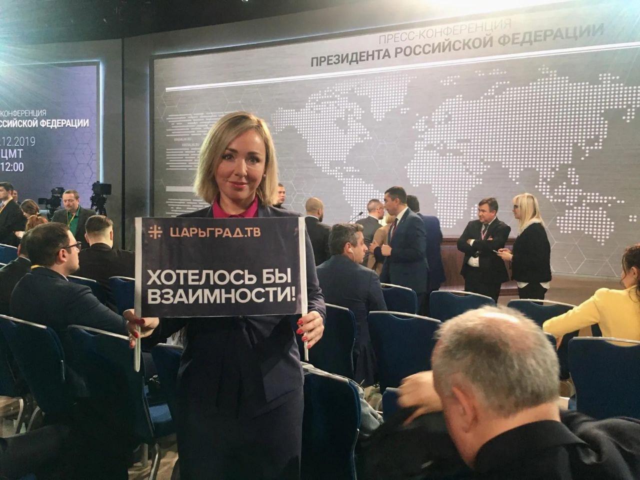 11:43 Корреспондент Царьграда Анна Вавилова в прошлом году смогла задать свой вопрос президенту. Глава государства обратил внимание на табличку в её руках. На этот раз Анна заготовила не менее "говорящую": "Хотелось бы взаимности!"