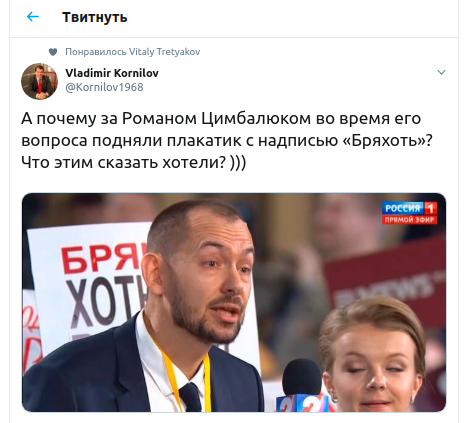 14:06 Политолог Владимир Корнилов: "А почему за Романом Цимбалюком во время его вопроса подняли плакатик с надписью "Бряхоть"? Что этим сказать хотели? )))"