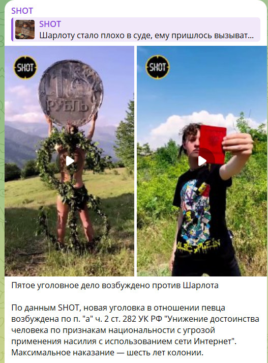 В мае сообщалось о пятом уголовном деле против Шарлота по статье "Унижение достоинства человека по признакам национальности с угрозой применения насилия с использованием сети Интернет". Максимальное наказание - шесть лет колонии. Как выяснил SHOT, причиной ещё одного дела стала давняя история Шарлота в запрещённой соцсети, в которой он написал: