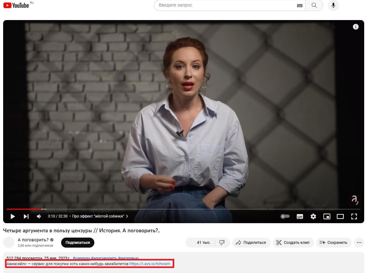 Реклама "Авиасейлс" – частый "гость" на канале Ирины Шихман*. И даже за этот не самый рейтинговый выпуск ведущая-иноагент могла получить минимум 150 тысяч рублей. Скриншот: ютуб-канал "А поговорить?"