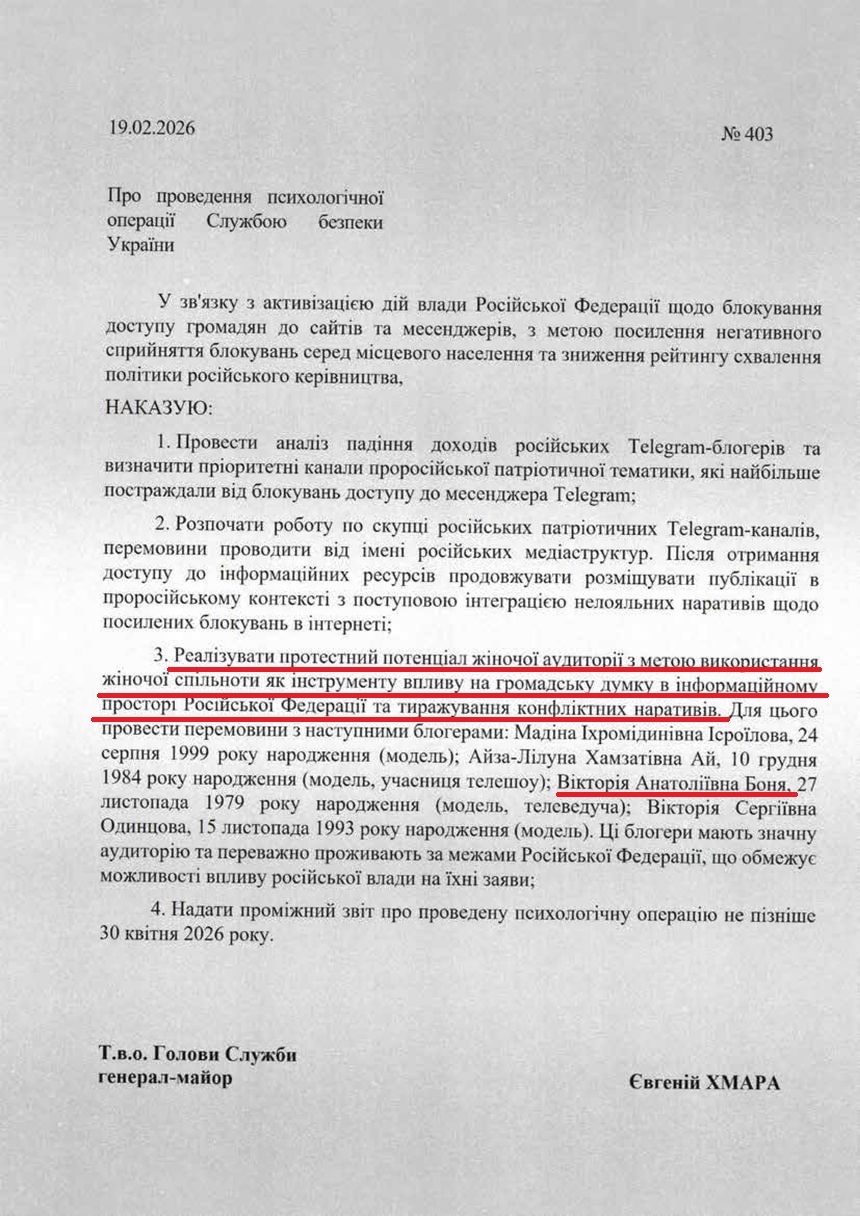 На этом фоне довольно интересно выглядит материал польского издания Salon24 под названием "Российская модель Виктория Боня стала участницей психологической операции украинских спецслужб". Там был опубликован документ СБУ от 19 февраля 2026 года о проведении психологической операции с использованием русских блогеров.