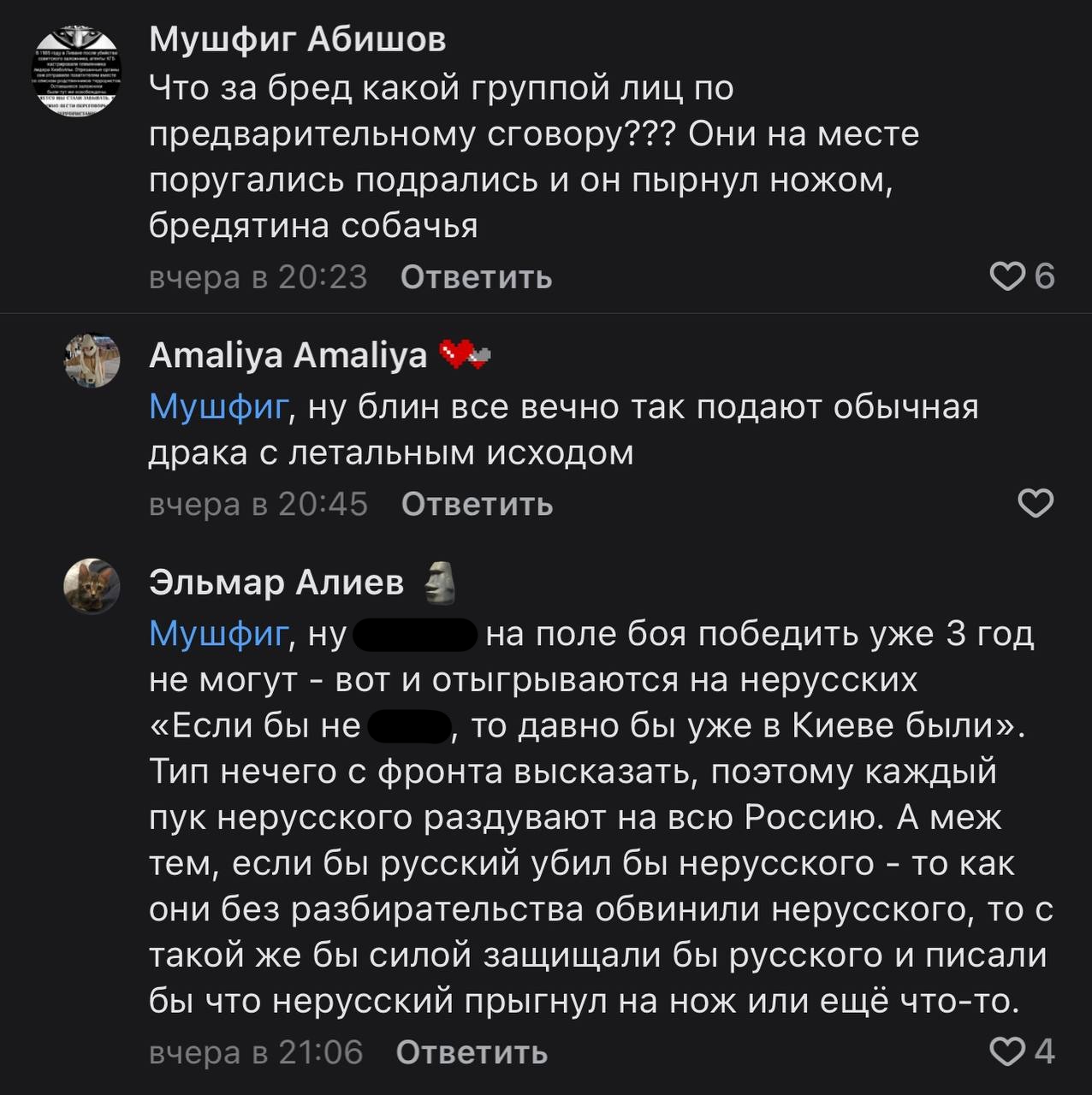Представляете, иностранный специалист ответил, что это всем остальным должно быть стыдно! Видимо, за то, что довели его "братишку" до убийства. Реакцией близкого родственника мигрантское лобби не ограничилось. Телеграм-канал "Многонационал" показал типичные комментарии из азербайджанского паблика. И что самое страшное, все эти "защитники" спокойно живут в России среди нас.
