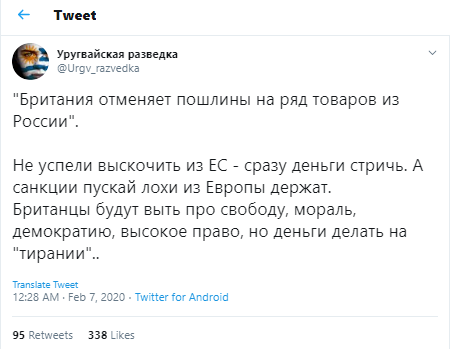 Великобритания планирует снять часть торговых санкций в отношении страны — это произойдёт после полного завершения процедуры выхода из ЕС. В Сети поползли слухи, что на самом деле "Брексит — это проект Кремля", но большинство уверено, что британцы просто действуют прагматично.