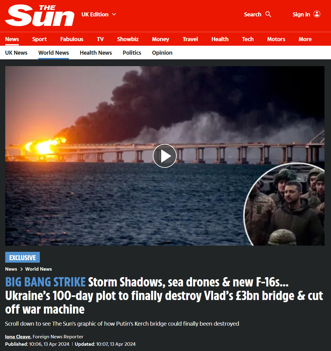 РАКЕТЫ STORM SHADOWS, МОРСКИЕ БЕСПИЛОТНИКИ И НОВЫЕ F-16... 100-ДНЕВНЫЙ ПЛАН УКРАИНЫ ОКОНЧАТЕЛЬНО РАЗРУШИТЬ МОСТ ПУТИНА СТОИМОСТЬЮ 3 МИЛЛИАРДА ФУНТОВ СТЕРЛИНГОВ И ОСТАНОВИТЬ ВОЕННУЮ МАШИНУ. ФОТО: СКРИНШОТ СТРАНИЦЫ THESUN.CO.UK