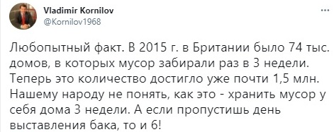 Политолог Владимир Корнилов в своём Twitter рассказал о системе вывоза мусора в Великобритании. Он заметил, что ещё в 2015 году в Британии было 74 тысячи домов, из которых мусор забирали лишь раз в три недели. Сейчас эта цифра выросла ещё больше и достигла 1,5 миллионов домов.