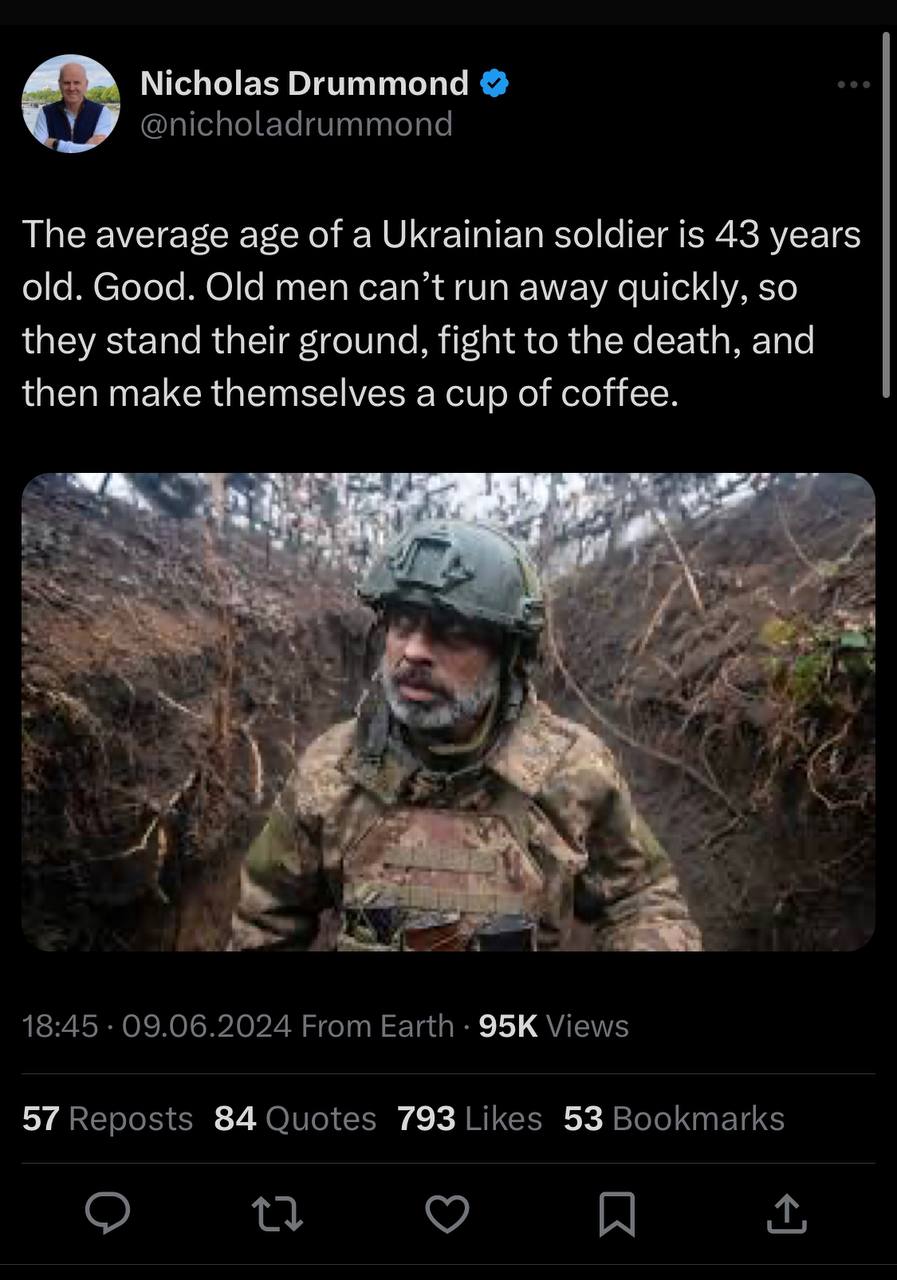 Средний возраст украинского солдата - 43 года. Это хорошо. Старики не могут быстро убежать, поэтому стоят на своём, сражаются насмерть, а потом заваривают себе чашечку кофе.
