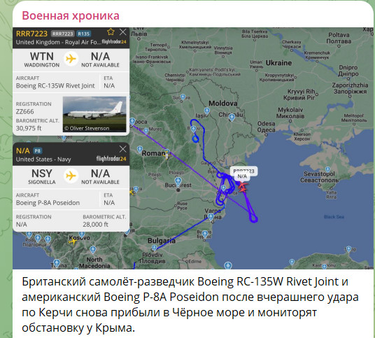 Британский самолёт-разведчик Boeing RC-135W Rivet Joint и американский Boeing P-8A Poseidon после вчерашнего удара по Керчи снова появились над Чёрным морем и мониторят обстановку у Крыма, пишет "Военная хроника".