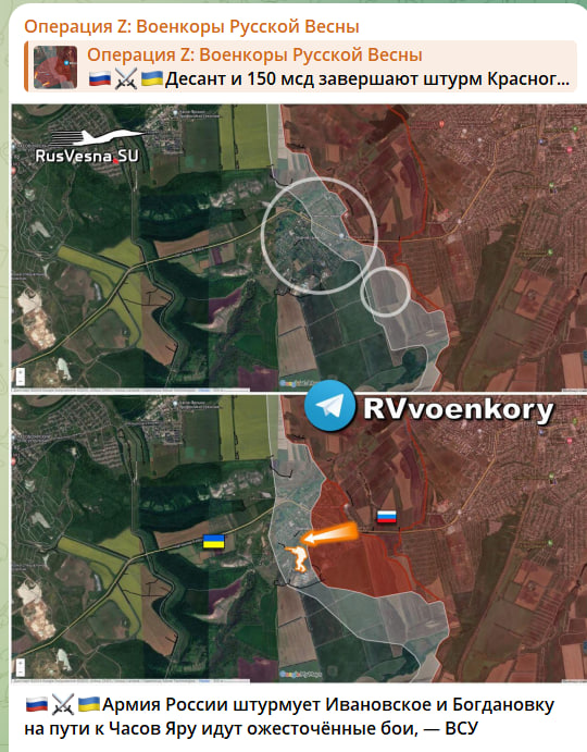 Очередным триумфом ВС РФ стало практически полное освобождение Ивановского и Богдановки, что создаёт очередной котёл вокруг Часова Яра. Ожесточённые бои продолжаются, но перевес оказался на стороне России. Боевики сам заявили, что несут огромные потери под постоянным огнём, однако существенная часть этих потерь связана с тем, что остатки выживших солдат противника пытаются бежать с поля боя, оставляя раненых под постоянным огнём.