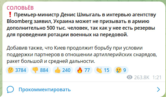 - цитирует Шмыгаля Владимир Соловьёв в своём канале.