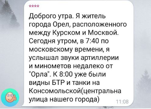 Доброго утра. Я житель города Орёл, расположенного между Курском и Москвой. Сегодня утром, в 7:40 по московскому времени, я услышал звуки артиллерии и миномётов недалеко от "Орла". К 8:00 уже были видны БТР и танки на Комсомольской (центральная улица нашего города),