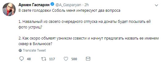 Гаспарян написал в своем Twitter, что его интересуют два вопроса – будет ли Алексей Навальный из своего очередного отпуска посылать ей фото устриц, купленных на донаты сторонников, и как скоро её объявят "узником совести" и начнут предлагать назвать ее именем сквер в Вильнюсе.