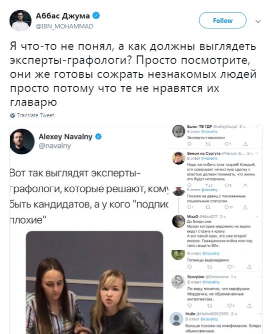 Прокомментировал недовольство оппозиционеров и журналист-международник Аббас Джума. Он обратил внимание на твит Навального, в котором он приводит фото экспертов-графологов, бракующих ошибочные подписи.