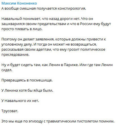 Навальный понимает, что назад дороги нет. Что он зашкварился своим предательством и что в России ему будут просто плевать в лицо. Ну и будет сидеть там, как Ленин в Париже. Или где там Ленин сидел, - пишет журналист в Telegram.