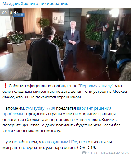 Мэр Москвы Сергей Собянин, выступая в эфире Первого канала, напугал москвичей, предупредив их о голодных бунтах, которые обязательно произойдут, если трудовым мигрантам не дать денег.