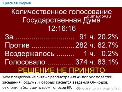 Отметим, что депутат Александр Хинштейн, говоря о протестах в обществе против QR, привёл совершенно другие цифры. По его словам, за ноябрь-декабрь в аппарат Думы поступило 57 тыс. телеграмм и писем с просьбой не принимать закон. Коммунисты же говорят о 3 млн обращений.