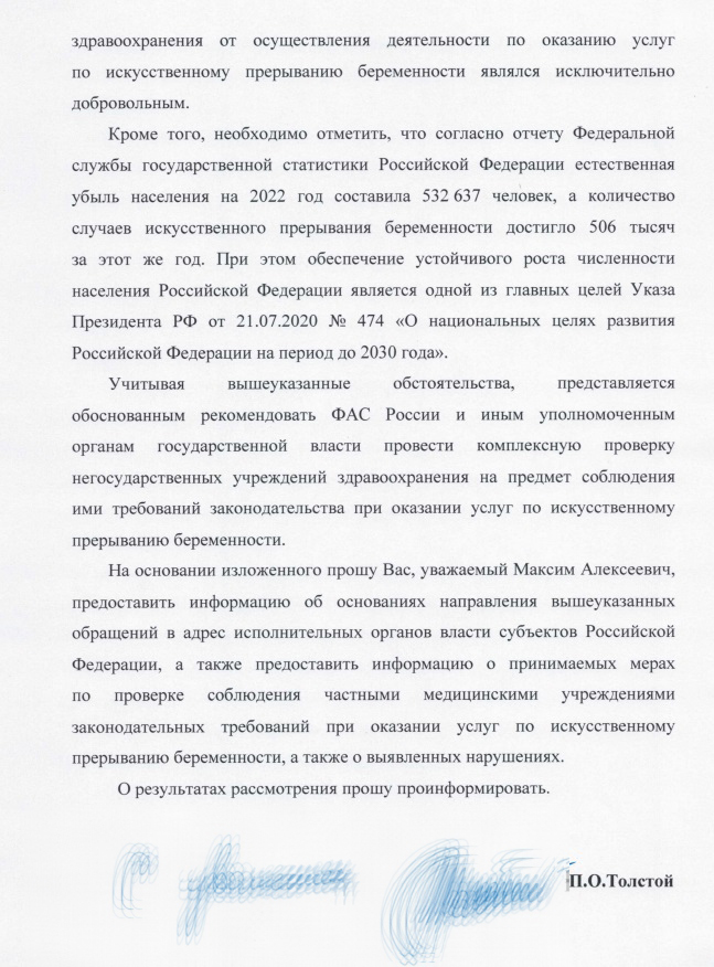 В связи с представленными выше фактами Толстой просит не только ответить на его запрос на основании изложенного, но и провести силами ФАС России и другими уполномоченными органами "комплексную проверку негосударственных учреждений здравоохранения на предмет соблюдения ими требований законодательства при оказании услуг по искусственному прерыванию беременности.