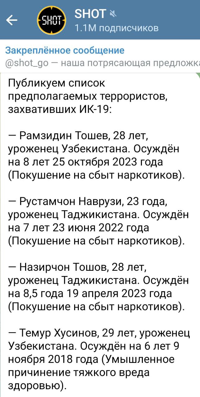 Телеграм-канал SHOT опубликовал список пострадавших при бунте в колонии: