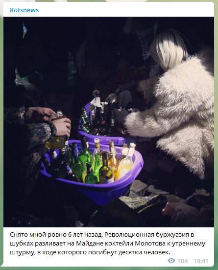 "Снято мной ровно шесть лет назад. Революционная буржуазия в шубках разливает на Майдане "коктейли Молотова" к утреннему штурму, в ходе которого погибнут десятки человек", - написал Александр Коц.