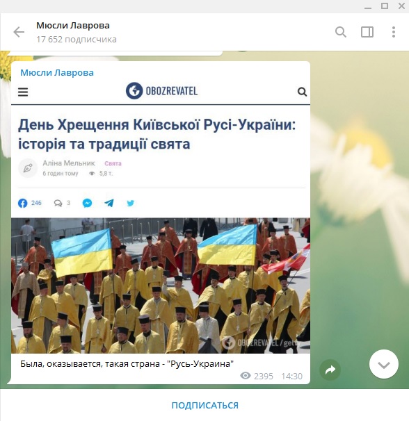 Украинское издание "Обозреватель" выпустило сегодня статью под названием "День Хрещення Киiвьскоi Русi-Украiни: iсторiя та традицii свята". Уже по одному только заголовку видно, как свидомых украинских патриотов корёжит от того, что у Украины с Россией единая история, которая к тому же вскрывает всю абсурдность фарса с "незалежностью".