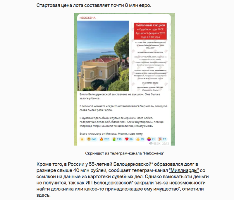 А на днях стало известно, что дама лишилась своего роскошного особняка во Франции. Оказалось, Белоника* взяла большой кредит под залог недвижимости. Заёмные средства не вернула, так что особняк продадут на аукционе.