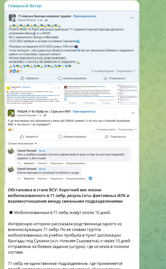 Группа боевиков ВСУ из 71-й егерской бригады в полном составе "испарилась" под Сумами. Мобилизованных (скорее, увы, "могилизованных") отправили на штурм русских позиций. Теперь их родные и близкие стенают в соцсетях: "Це капець".