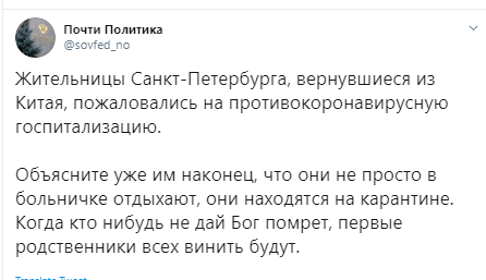 Помещённая в карантин петербурженка, вернувшаяся на днях из Китая, поделилась в соцсетях видео, в котором жалуется на условия содержания в больничной палате. Девушку возмутили наглухо закрытые окна и не первой свежести ремонт. Однако найти сочувствие в Сети ей не удалось: жалобщице доступно объяснили, что она не на курорте, и предложили вернуться в Китай, где она могла бы "шикарно устроиться" в Уханьском госпитале.