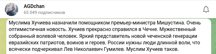 Неожиданными назначениями умеют удивлять не только в Кремле, но и в правительстве России. Оказалось, что в Москве уже высадился чеченский "десант". Философ, идеолог Русского мира Александр Дугин сообщил, что "Муслима Хучиева назначили помощником премьер-министра Мишустина".
