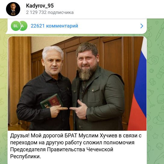 Ранее глава Чечни Рамзан Кадыров сообщил, что председатель правительства республики Муслим Хучиев сложил свои полномочия "в связи с переходом на другую работу". Философ Александр Дугин сообщил, куда именно назначили Хучиева. Судя по его информации, чеченский "десант" высадился в Москве.