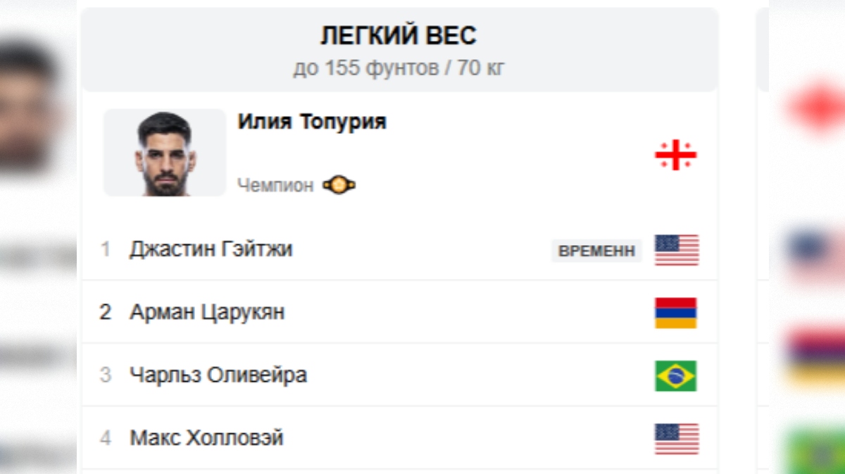 Лидером является Илия Топурия, у него чемпионский пояс, между ним и Царукяном известный американский боец Джастин Гэйтжи.