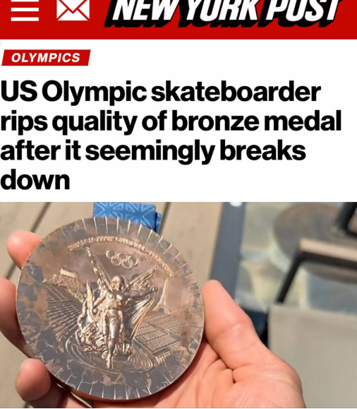 Американский скейтер Ниджа Хьюстон, который завоевал на Олимпиаде в Париже бронзовую медаль, пожаловался на то, что уже через несколько дней награда утратила былой лоск и стала "облезать". Часть изображения заметно потемнела, и теперь медаль выглядит так, словно пережила войну.