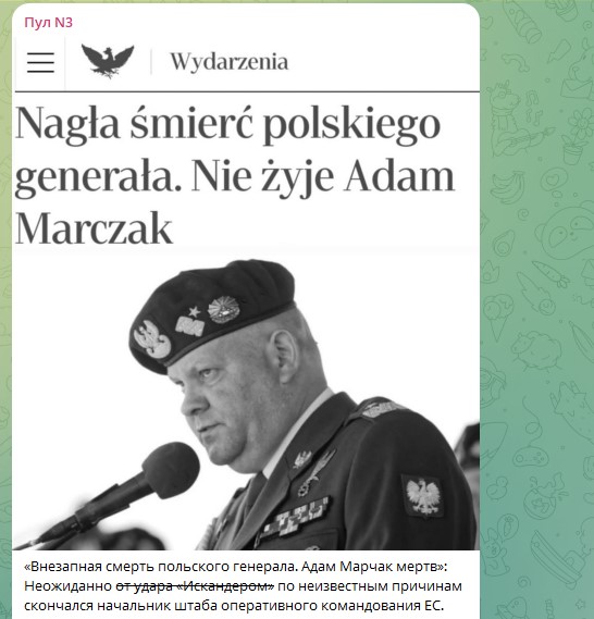 Так, стало известно о смерти некоего генерала Адама Марчака. Источники из вооружённых сил Польши уверяют: генерал скончался "по естественным причинам". Есть некий момент, который не стали освещать в местных СМИ.