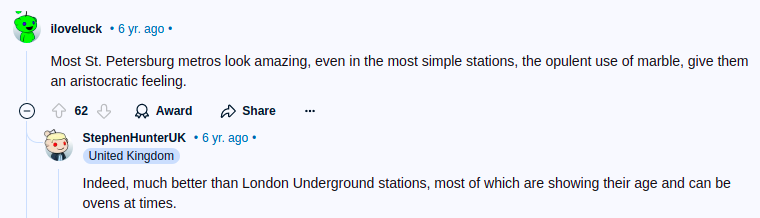 Британец с ником StephenHunterUK даже признался, что, по его мнению, метро в Лондоне заметно уступает петербургскому: