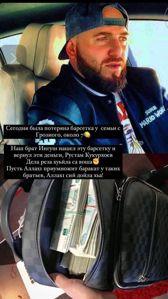 Неожиданно по дороге он заметил барсетку. Открыв её, ингуш обнаружил 7 млн рублей. Рустам не стал забирать столь ценную пропажу себе, а рассказал о случившемся в соцсетях.