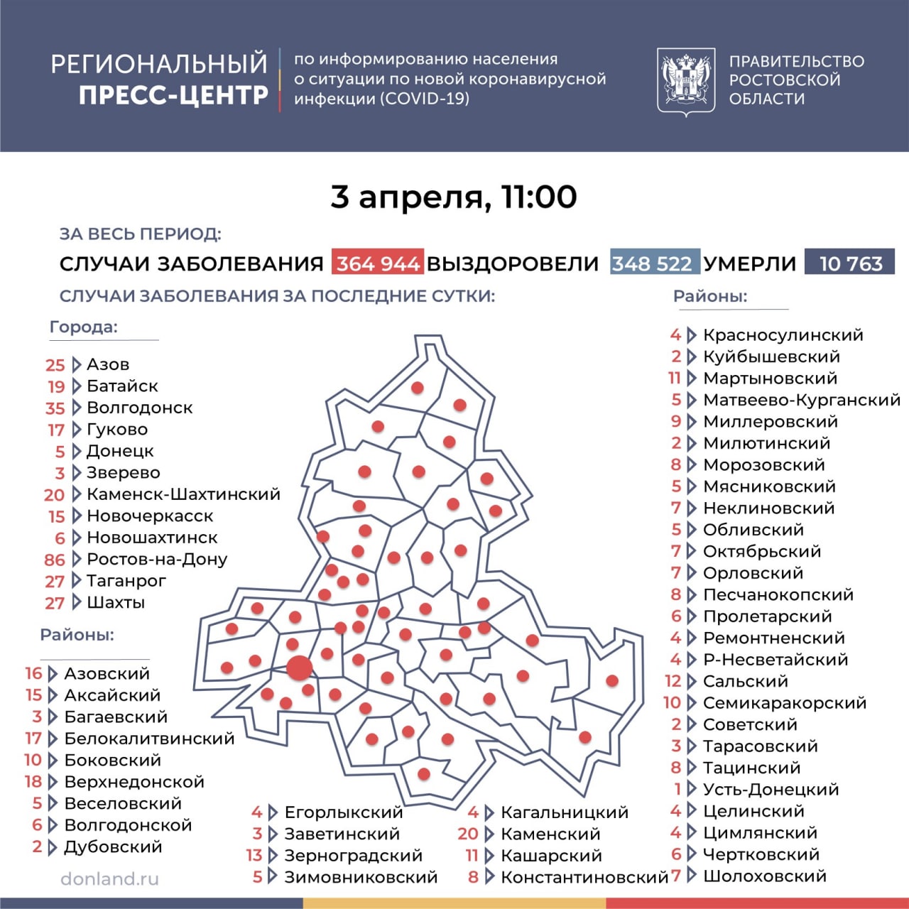 Больше всего новых случаев на 3 апреля 2022 выявлено в Ростове, Волгодонске, Таганроге и Шахтах.