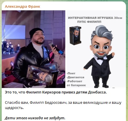 Достаточно вспомнить раздачу Киркоровым кукол имени себя любимого детям Донбасса,
