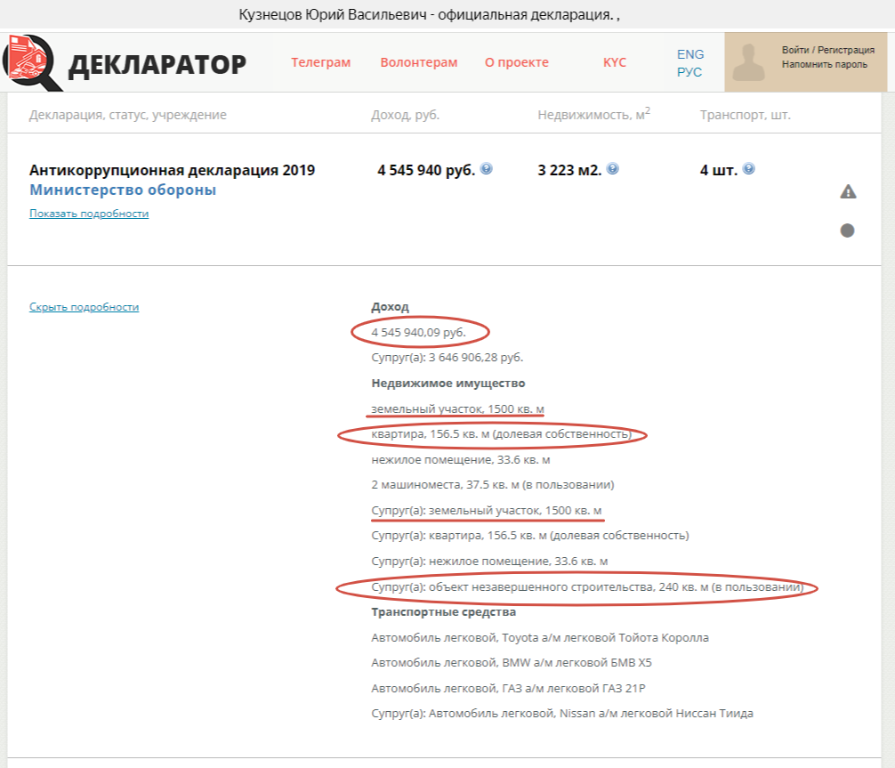 ЗАРАБАТЫВАЛ ГЕНЕРАЛ КУЗНЕЦОВ НЕМАЛО, НО ВРЯД ЛИ УСПЕЛ БЫ НАКОПИТЬ, ДАЖЕ С УЧЁТОМ ДОХОДОВ СУПРУГИ, ЗА НЕСКОЛЬКО ЛЕТ 100 МИЛЛИОНОВ НАЛИЧНЫМИ. СКРИНШОТ СТРАНИЦЫ САЙТА DECLARATOR.ORG