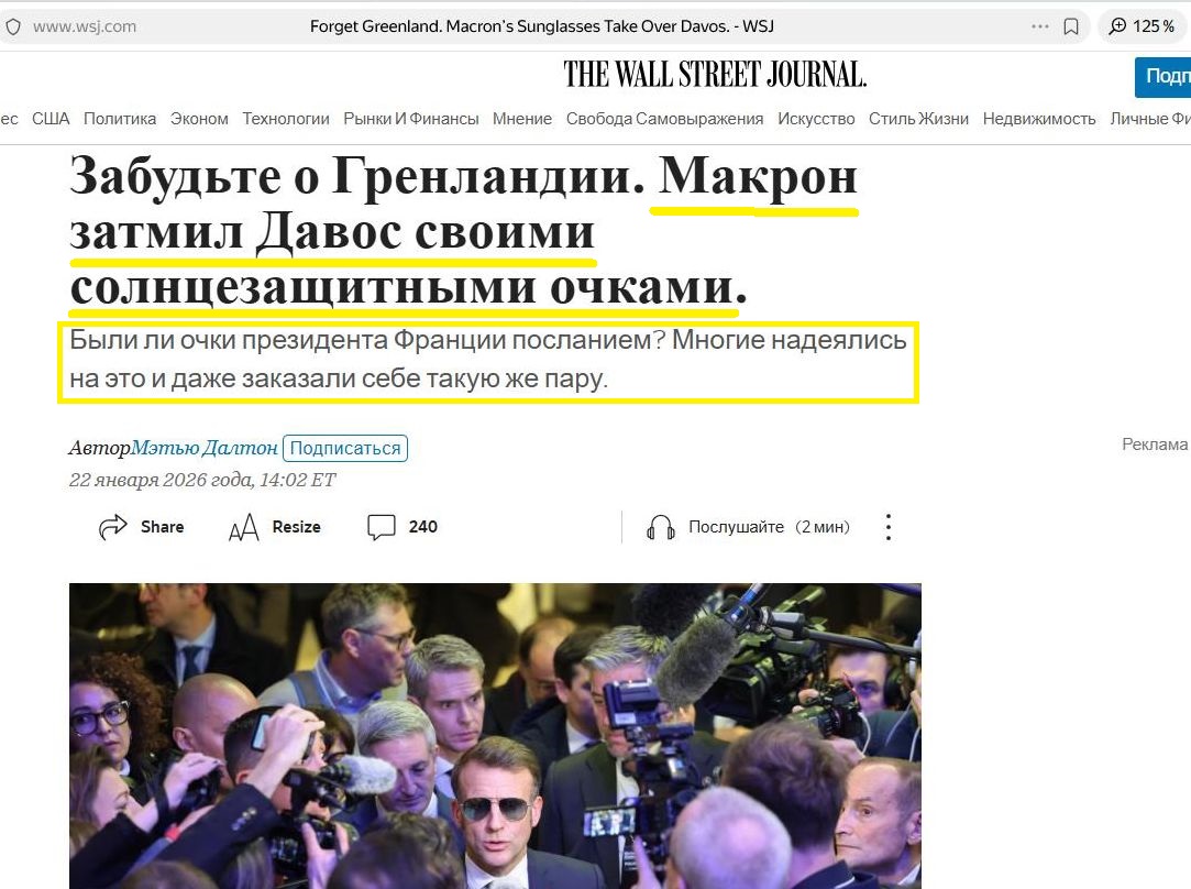 Итак, американские СМИ всерьёз рассуждают о том, что своими тёмными очками на Давосском форуме Макрон решил послать сигнал Трампу. Мол, мы, гордые и стойкие европейцы, не поддадимся ни на тарифный шантаж, ни на угрозы захватить Гренландию. И лучшее свидетельство этому – посмотри, Дональд, как брутально выгляжу я, Эммануэль, в этих очках. Ещё чуть-чуть – и вылитый Наполеон…
