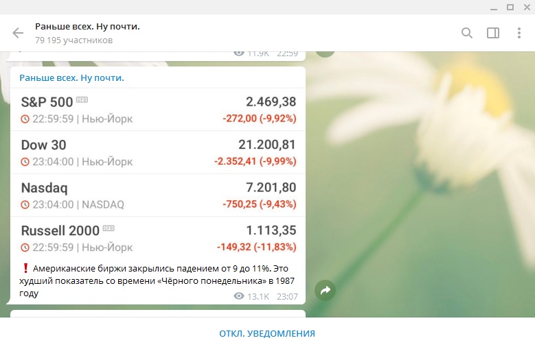 Торги на биржах США завершились падением, которого не видели с "чёрного понедельника" 1987 года. Оно составило от 9% до 11%.