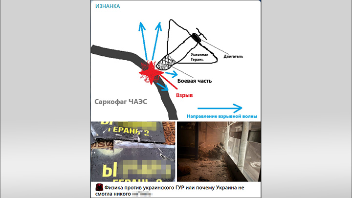 Сначала украинцы задействовали БПЛА 2023 года выпуска - серийные номера обломков сразу выдали подлог. Главный прокол: двигатель "Герани" затащили внутрь саркофага, чтобы шокировать публику. Но конструкция дрона неумолима - заряд впереди, мотор сзади. При взрыве движок отлетает назад, и по законам физики не мог провалиться в дыру от собственной боеголовки. Безграмотность инсценировки бросалась в глаза, её спешно замяли.