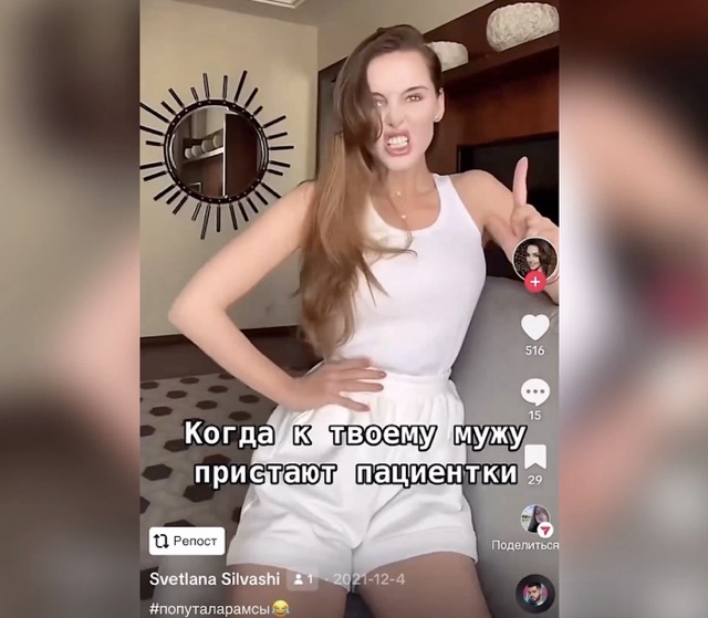 Жена известного "доктора" высмеивает ситуацию в видеоролике с заголовком "Когда к твоему мужу пристают пациентки". Женщина решила, что в такой обстановке можно безнаказанно насмехаться над пострадавшими, которые не могут добиться справедливости.