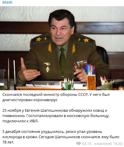 Во вторник стало известно о смерти Евгения Шапошникова, который был последним министром обороны Советского Союза, а также главнокомандующим Объединёнными Вооружёнными Силами СНГ.