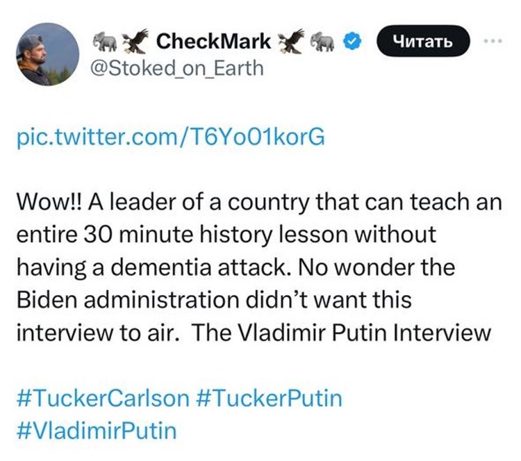 Количество зрителей, посмотревших двухчасовую беседу Такера Карлсона и Владимира Путина, спустя сутки составляет десятки миллионов человек - скоро будет преодолена отметка в 200 млн просмотров. При этом русофобские политические элиты Запада яростно пытаются "перебить" эффект разорвавшейся информационной бомбы.