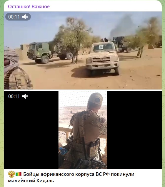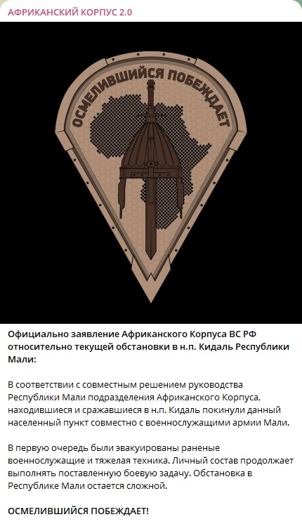 Подразделения Африканского корпуса, находившиеся и сражавшиеся в населенном пункте Кидаль, покинули данный населенный пункт совместно с военнослужащими армии Мали,