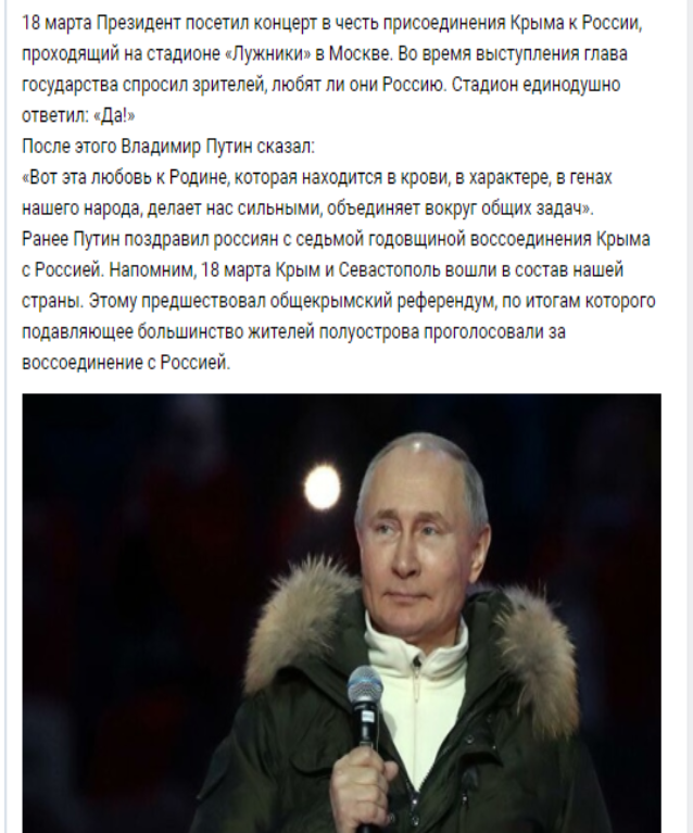 В ходе концерта, прошедшего в четверг, 18 марта, в Лужниках и посвящённого присоединению Республики Крым к России, президент страны Владимир Путин рассказал о своей любви к Родине.