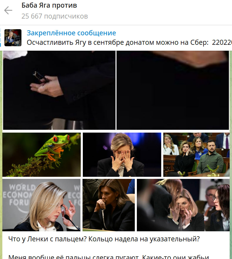 Русская журналистка Наталья Радулова в своём телеграм-канале "Баба Яга против" обратила внимание общества на фотографии супруги нелегитимного президента УкраиныВладимира Зеленского Елены. Вернее, даже не на фотографии в целом, а на конкретную часть тела "первой леди" Украины: Радулову удивили пальцы Зеленской.