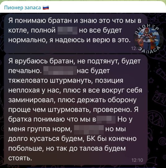 Продолжают поступать противоречивые данные. В частности, военкор Романов заявил о полной потере города. Военблогер, автор канала "Пионер Запаса" публикует сообщения, по его словам, бойцов ГрВ "Запад", которые описывают ситуацию как "полная жесть".