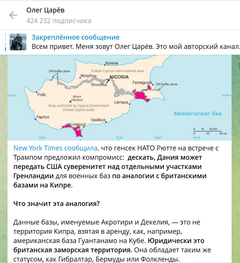 Юридической аналогии передачи гренландской территории под американский суверенитет в истории с Акротири нет. Кипр был британской колонией, а когда в 1960 получал независимость англичане, ему просто не отдали территорию своих баз. А здесь независимая Дания должна уступить свою территорию государству, которое ею не владеет. То есть сравнение Рютте некорректно,