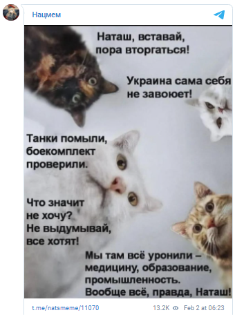 В итоге всё те же коты предупреждают Наташу, что русские танки уже готовы к марш-броску, что на Украине всё уронили и что пора вторгаться, поскольку "Украина сама себя не захватит".